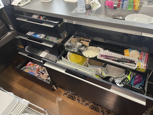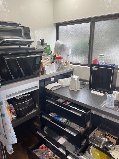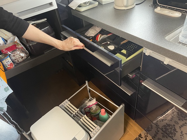 以前は、ザ・昔の台所で作業スペースや収納スペースが狭く、調理器具などの物でゴチャゴチャしていましたが、すべて下に収納できるので、驚くほどすっきりしました。