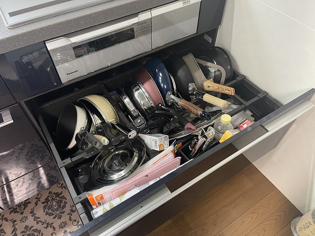 IHクッキングヒーターの下に大きな収納スペースを付けたので、たくさんあった鍋類がすべて入れられてスッキリしました。