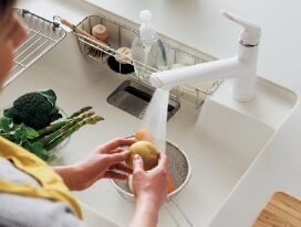汚れがつきにくく、落としやすい「スゴピカ素材」を採用。シンク廻りのキレイがつづく。